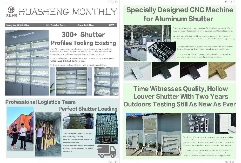On the production side, Huasheng Industry has demonstrated strong intelligent manufacturing capabilities. The new Shutter production line has officially started operation, bringing richer color options and more durable performance to Aluminum Shutter, allowing customers to obtain a higher quality, stable, and diverse product experience. The CNC specialized machine tool designed specifically for Aluminum Shutter, with the advantage of professional customization, optimizes the characteristics of Aluminum profiles, and has more stable processing performance and smoother cutting edges. Its intelligent positioning is precise and efficient, completing multiple hole processing in one operation, increasing efficiency by 300%, and the scrap rate is almost zero. At the same time, the heavy-duty steel structure body ensures the durability and stable operation of the equipment, greatly reducing maintenance costs and concerns. The user-friendly and intuitive touch interface makes operation convenient and fast, and also supports customized processing solutions, demonstrating the efficiency and flexibility of intelligent manufacturing.